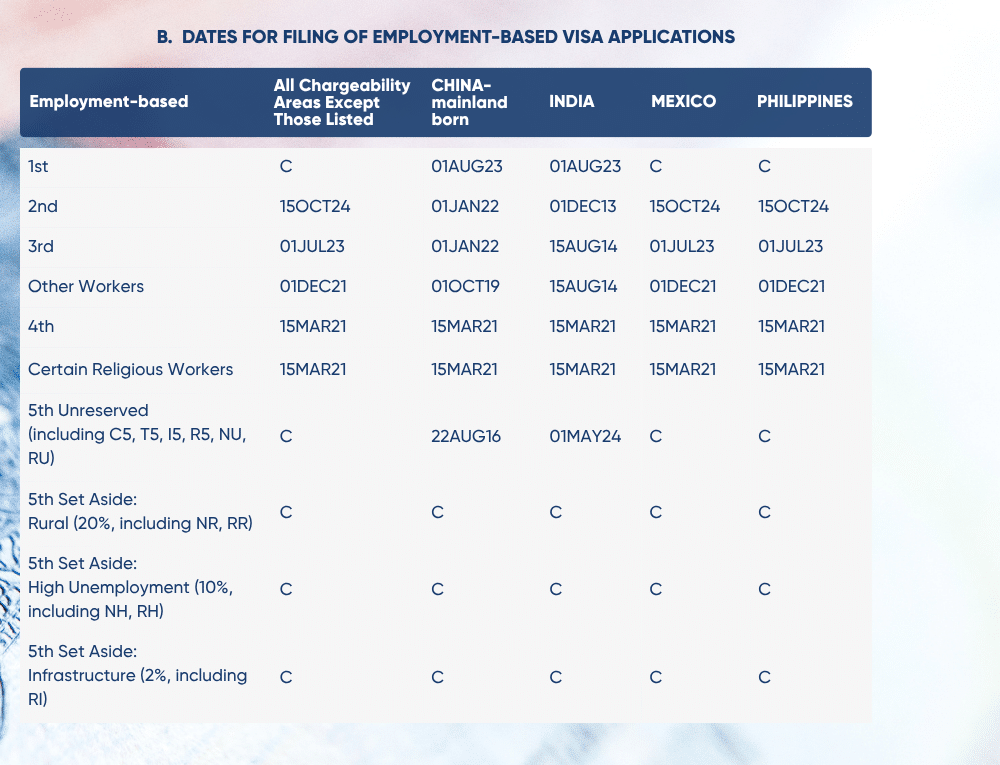 Trạng thái “C” cũng tiếp tục được duy trì ở mục Ngày Nộp Đơn. Đối với diện EB5, Việt Nam đang trong tình trạng “C” – sẵn có, nhà đầu tư EB5 không phải chờ đợi và có thể nộp đơn đến NVC bất cứ lúc nào để được đặt lịch phỏng vấn, xin visa.